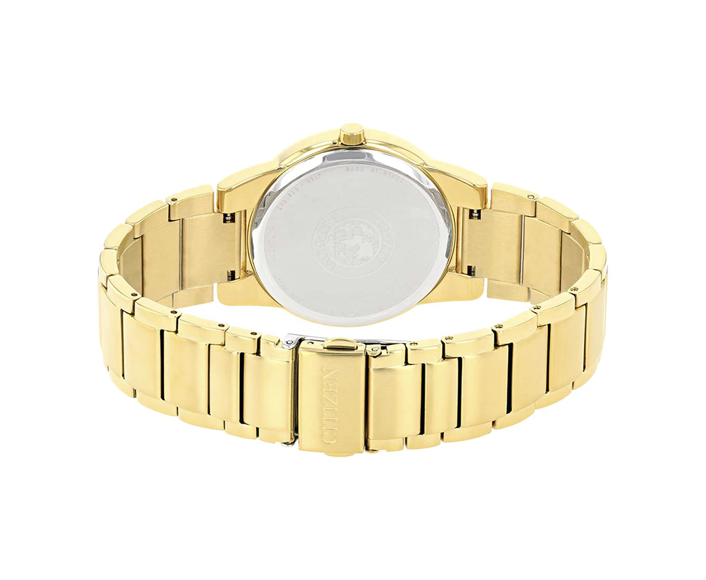 Funciones: Reloj de Pulsera Análogo, Dos Manecillas y Fechador de Caballero, esfera negra con Caja y Banda de Acero Inoxidable Dorado.