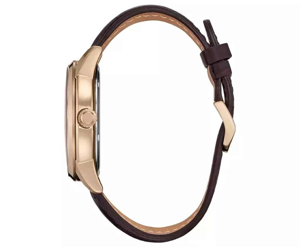 Funcion:Reloj de Pulsera Análogo, Tres Manecillas, Calendario, Indicador 24hrs de Caballero, esfera negra con Caja de Acero Inoxidable Oro Rosa y Banda de Cuero Marrón.